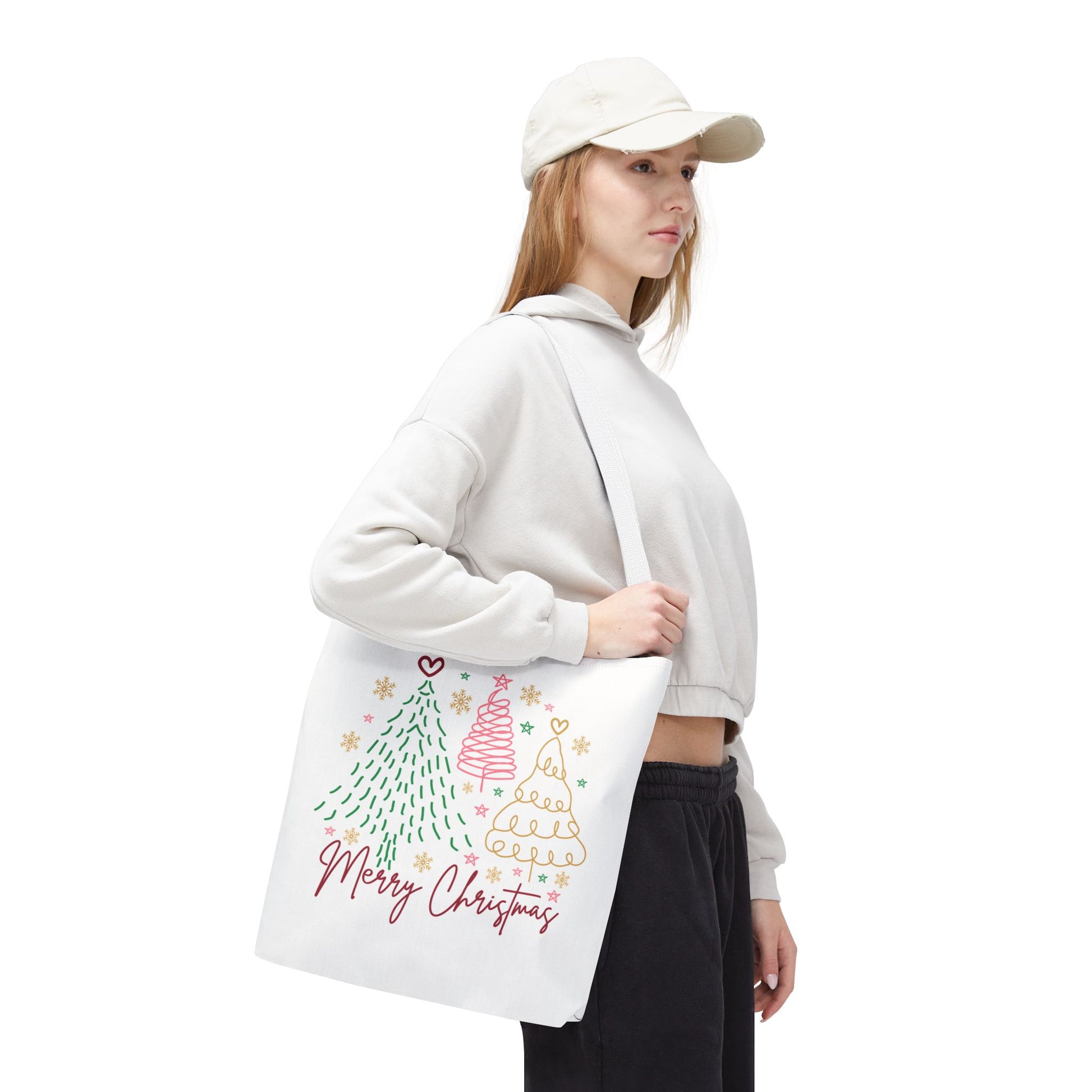Discover the perfect blend of functionality and festive cheer with this delightful tote bag. Crafted from 100% polyester, the bag offers exceptional durability while retaining its stylish design. Its lightweight fabric makes it ideal for daily use, whether you're heading to a holiday party or doing some last-minute shopping. The enchanting design featuring cheerful Christmas trees and the phrase "Merry Christmas" exudes a warm, joyful vibe that's sure to brighten anyone's day. This tote bag is perfect for anyone who loves embracing the holiday spirit, making it a wonderful gift for friends and family during Christmas or as a charming accessory for seasonal celebrations. With versatile sizing options and an array of handle colors, this tote fits seamlessly into any festive occasion or casual outing, ensuring you carry your essentials in style.