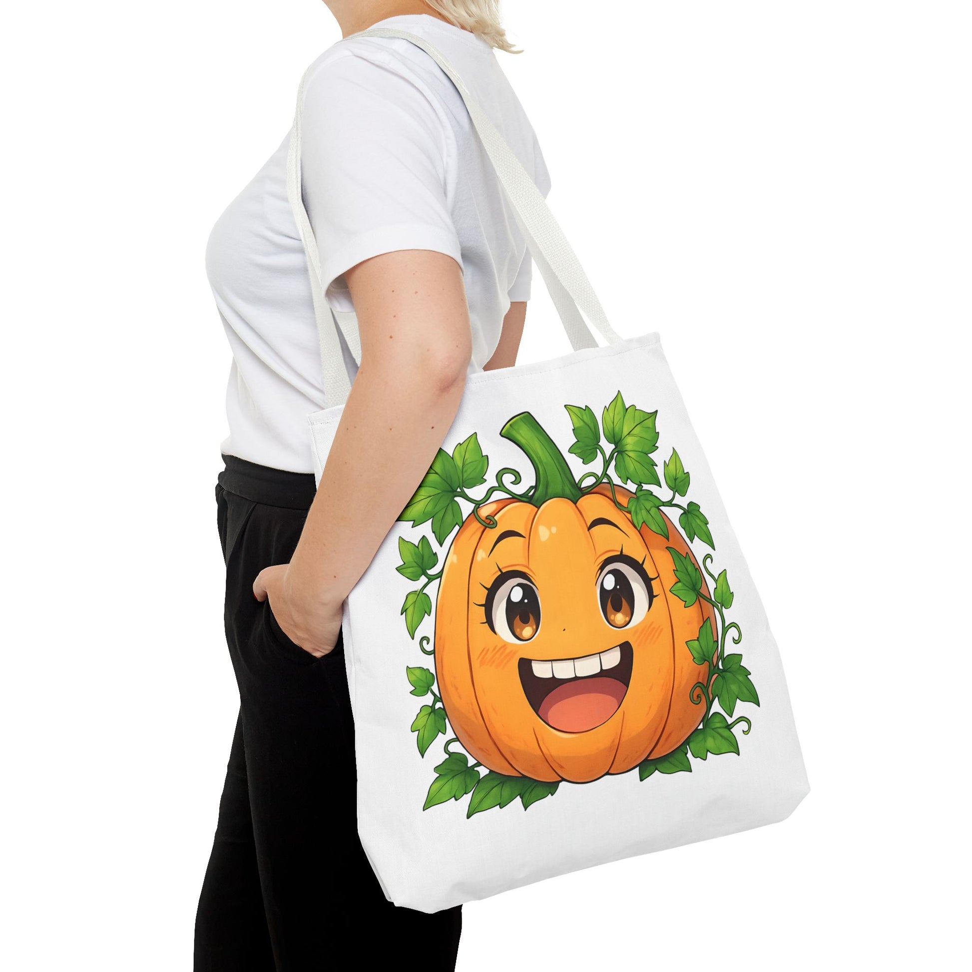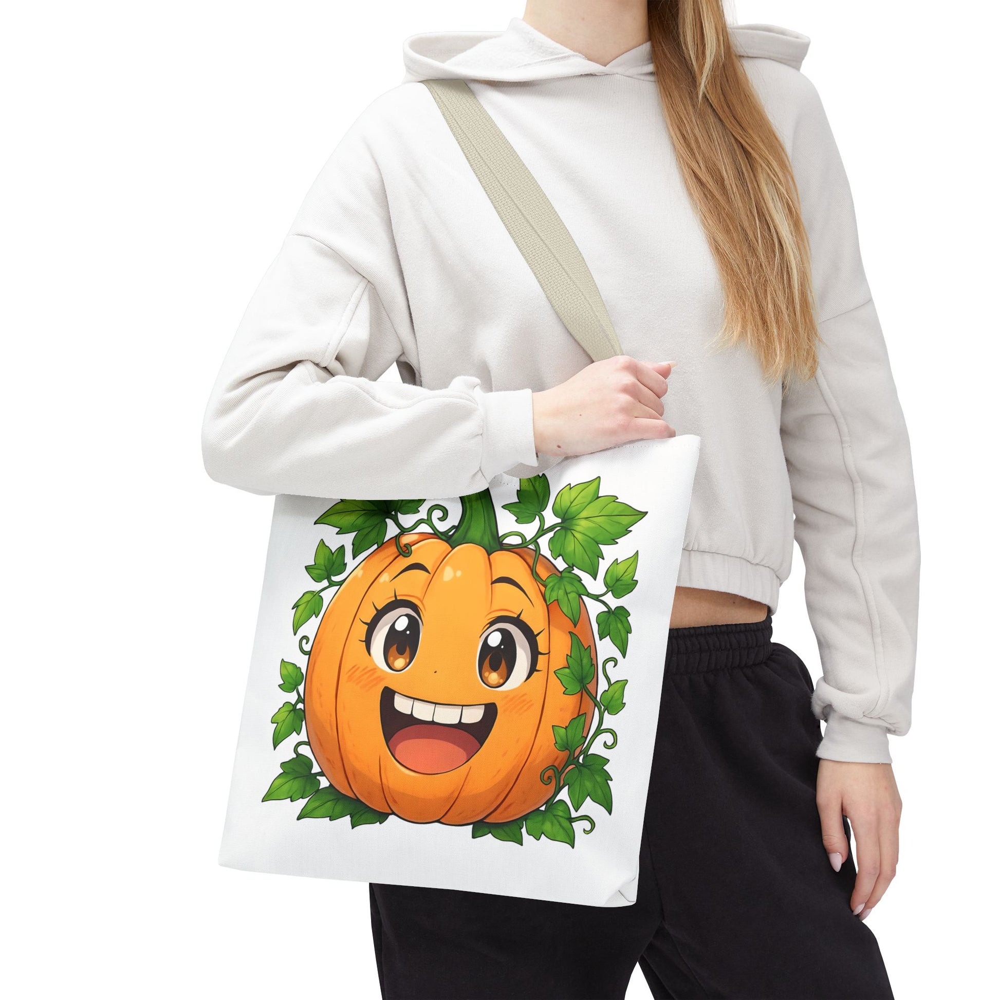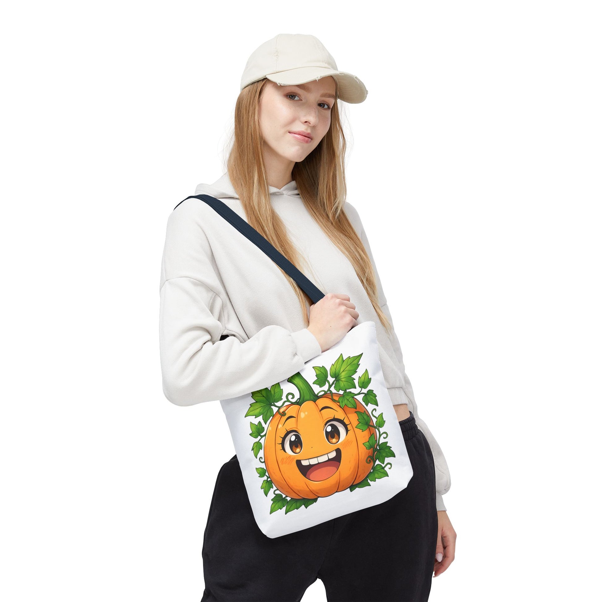Embrace the spirit of fun and festivity with this vibrant Tote Bag! Featuring a delightful pumpkin design surrounded by charming ivy, this tote captures the essence of autumn and Halloween celebrations. Crafted from 100% polyester, it’s not only durable but also retains its shape, making it perfect for everyday use or special occasions. Whether you're headed to the pumpkin patch, a fall festival, or just running errands, this tote adds a touch of whimsy to your outfit. Ideal for students, busy professionals, or anyone who loves seasonal flair. This bag is a wonderful gift for friends and family, especially around Halloween and Thanksgiving. Let it brighten your day and enhance your autumn adventures!