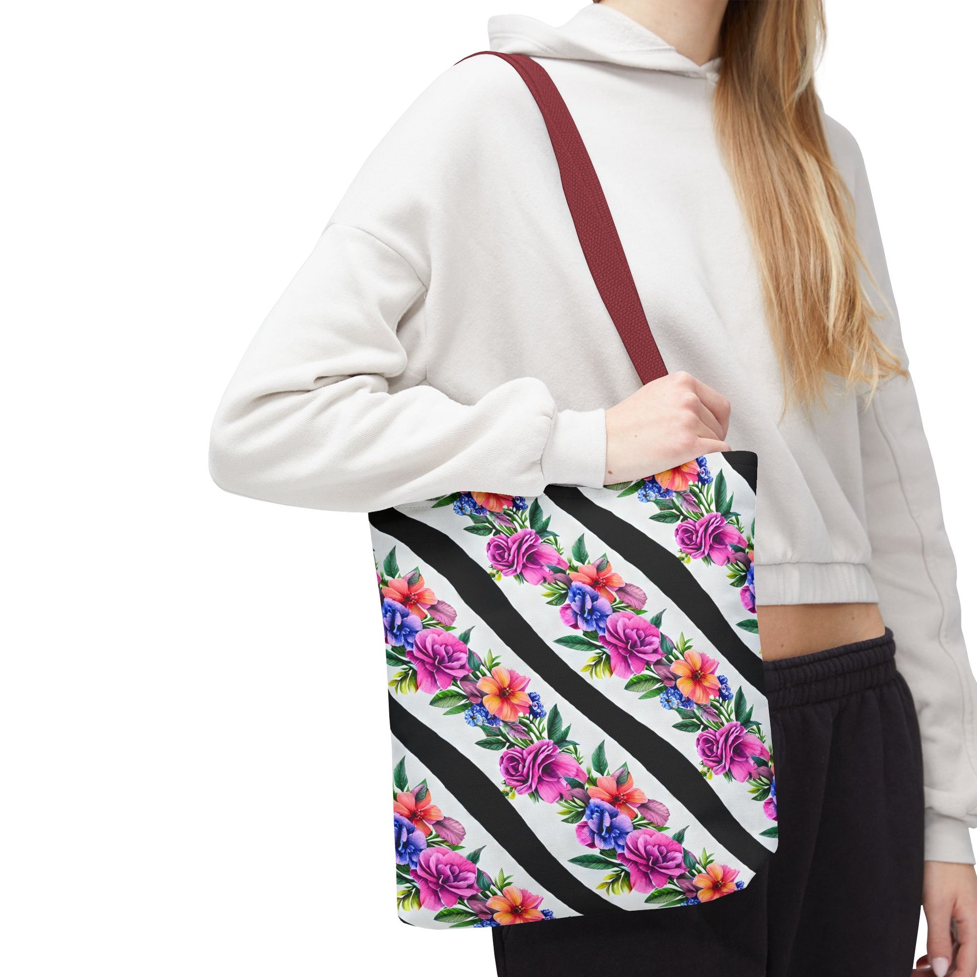 Elevate your accessory game with this stylish Tote Bag. Designed to bring a fresh and vibrant touch to your daily routine, it features a delightful floral pattern that radiates positivity and charm. Perfect for beach outings, grocery shopping, or as a trendy everyday carryall, this tote effortlessly fits into your busy lifestyle. Its charming design makes it an ideal gift for floral lovers, students, and eco-conscious shoppers alike. Celebrate occasions like birthdays, holidays, or just-because moments with a thoughtful gift that speaks to those who appreciate art in their accessories.
