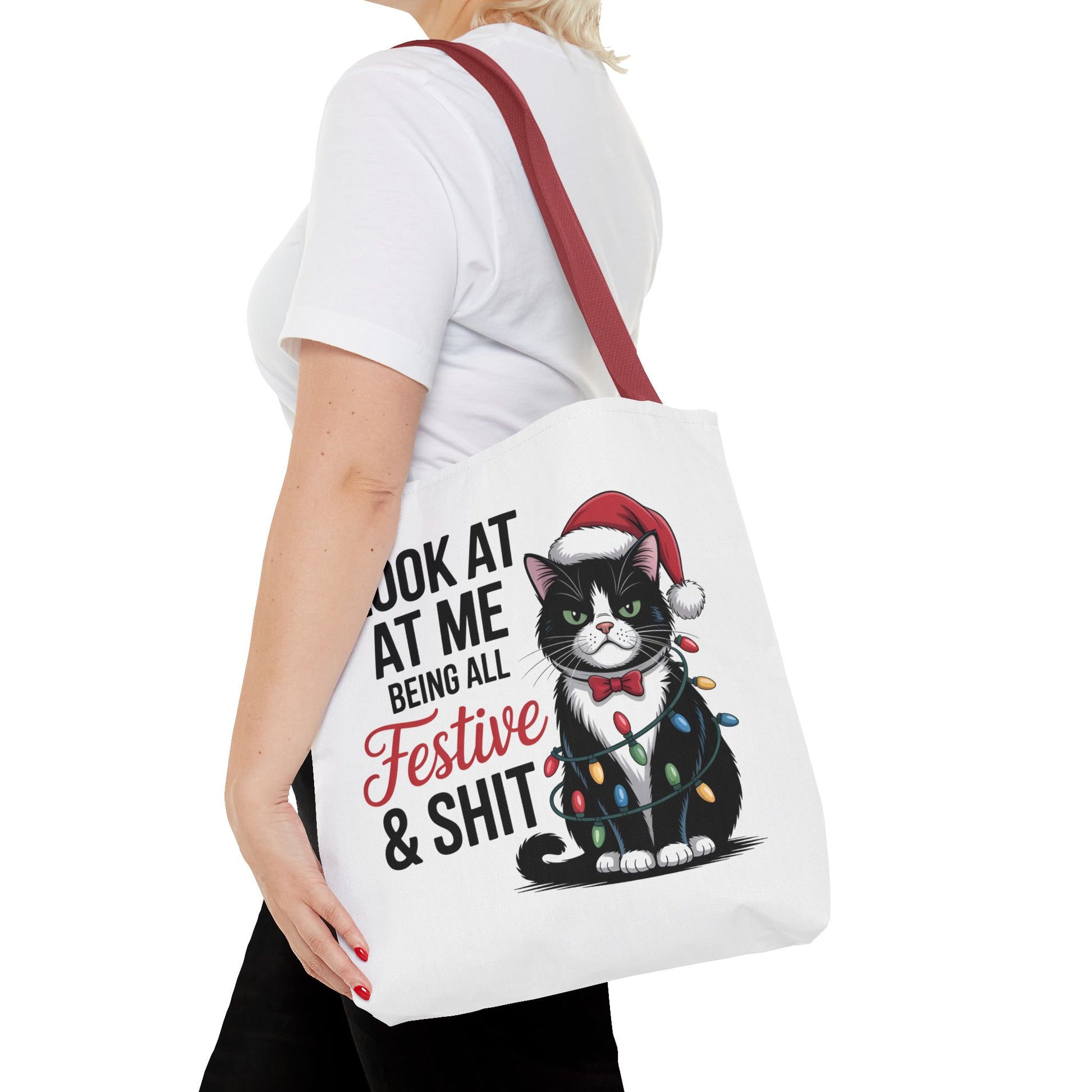 This vibrant Tote Bag is perfect for those looking to bring a touch of fun and personality to their daily errands. Featuring an adorable design with a festive cat adorned in holiday lights, it radiates joy and playfulness, making it a great accessory for the holiday season and beyond. The spacious interior provides ample room for groceries, books, or personal items, catering perfectly to busy individuals or gift-givers seeking a unique present. Ideal for cat lovers, holiday parties, or cheerful everyday use, this bag captures the spirit of celebration during occasions such as Christmas, birthdays, and casual outings. Make your errands an enjoyable experience with this eye-catching tote!