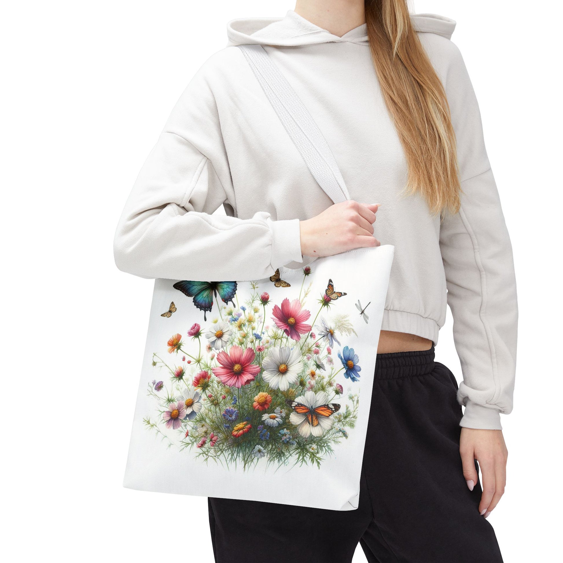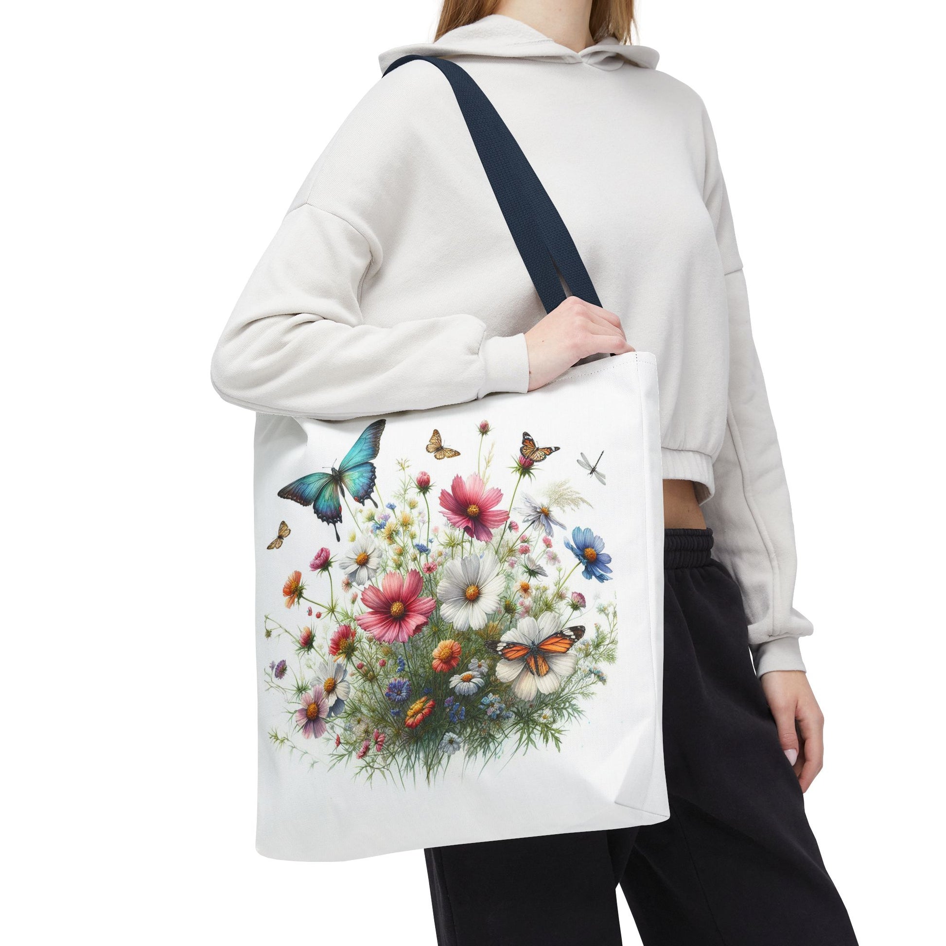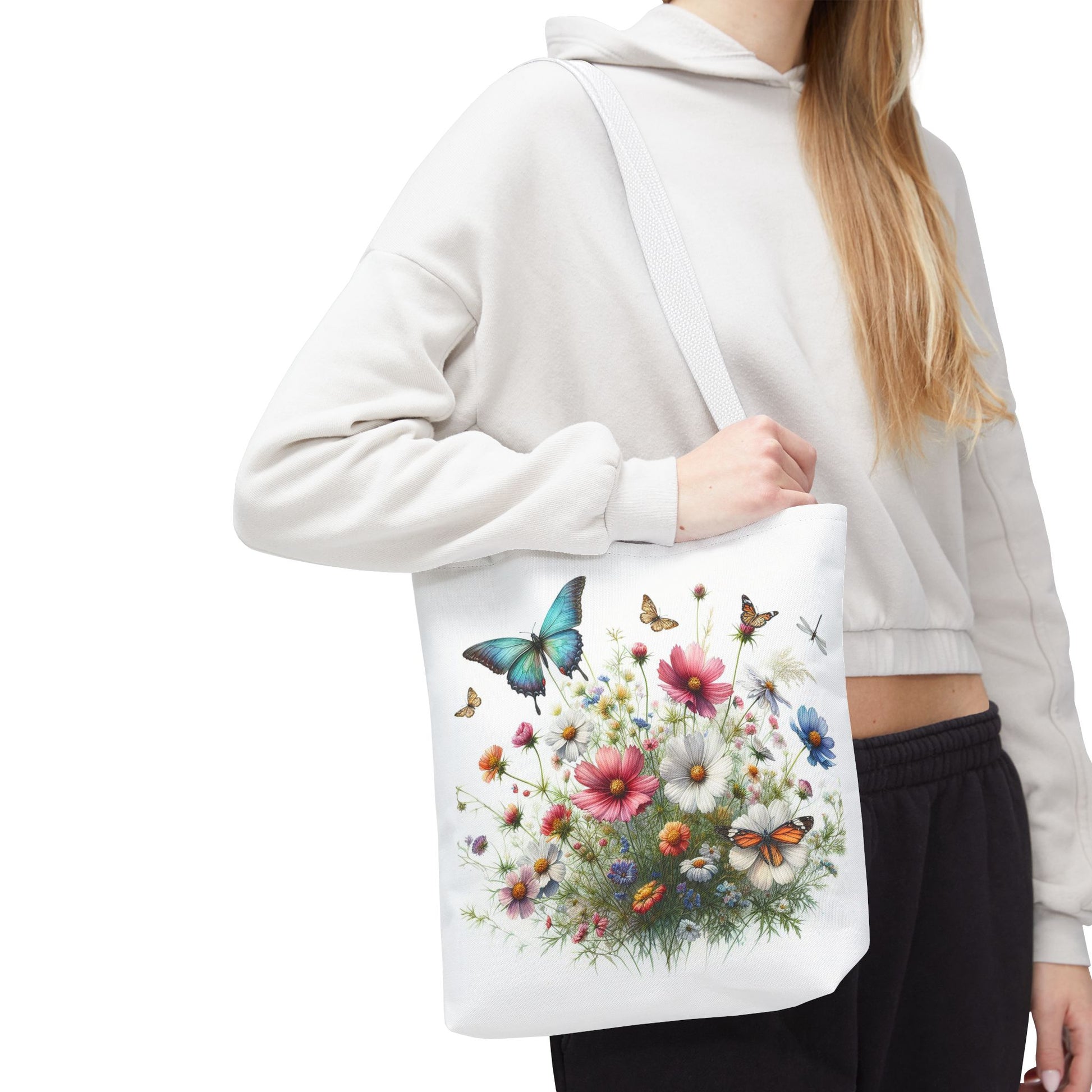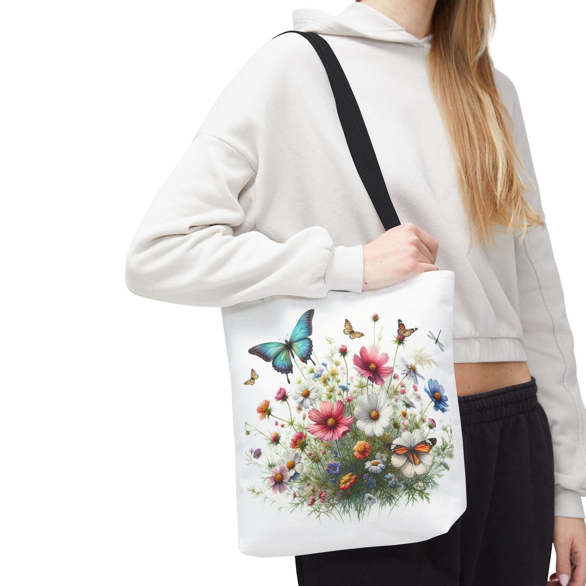 Introduce some vibrant charm to your daily routine with this stunning Tote Bag. This eye-catching accessory showcases a beautiful floral and butterfly design, bringing a touch of nature with every use. Perfect for carrying your essentials—whether you're heading to the farmer’s market, the beach, or a casual outing with friends. This tote is designed for those who appreciate both style and functionality. It makes a thoughtful gift for birthdays, Mother's Day, or just because. Add a splash of color to your life and express your love for nature with this unique tote!
